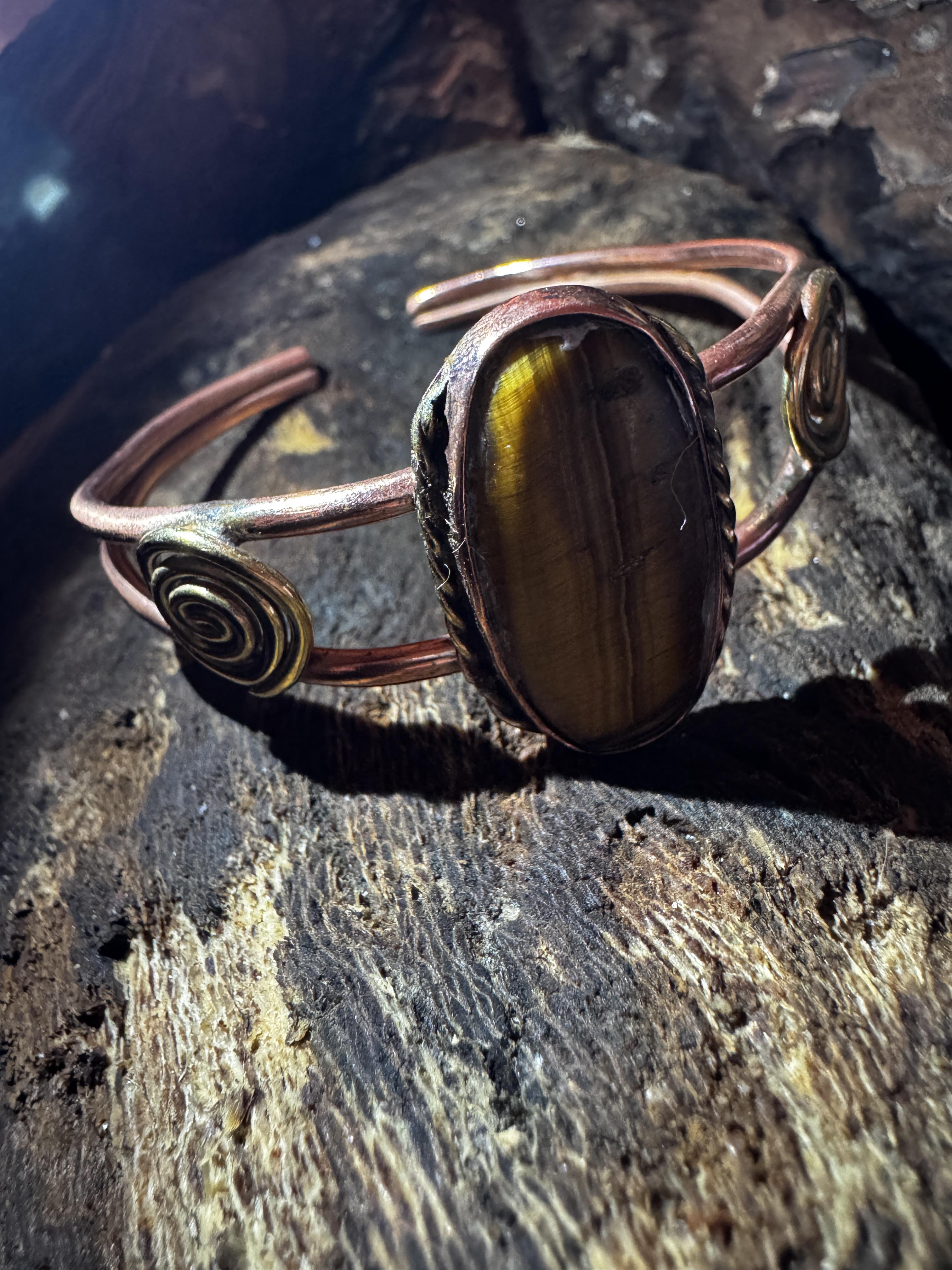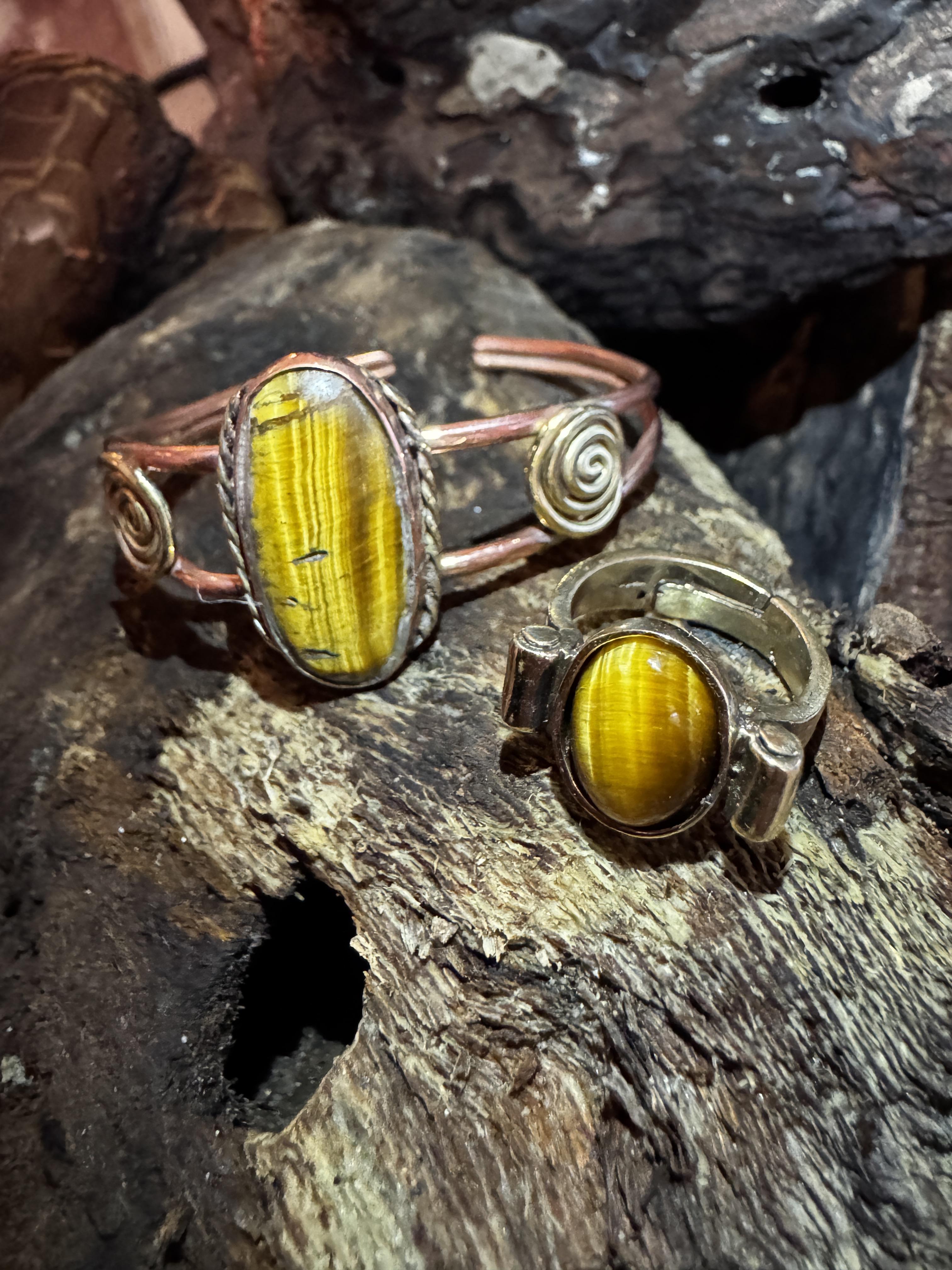 Dieses edle Schmuckset mit Tigerauge Stein kombiniert warm schimmerndes Kupfer und Messing mit der natürlichen Ausstrahlung eines kraftvollen Edelsteins. Der goldbraun leuchtende Tigerauge-Stein zeigt je nach Lichteinfall seinen typischen seidigen Schimmer und macht jedes Stück zu einem einzigartigen Blickfang.