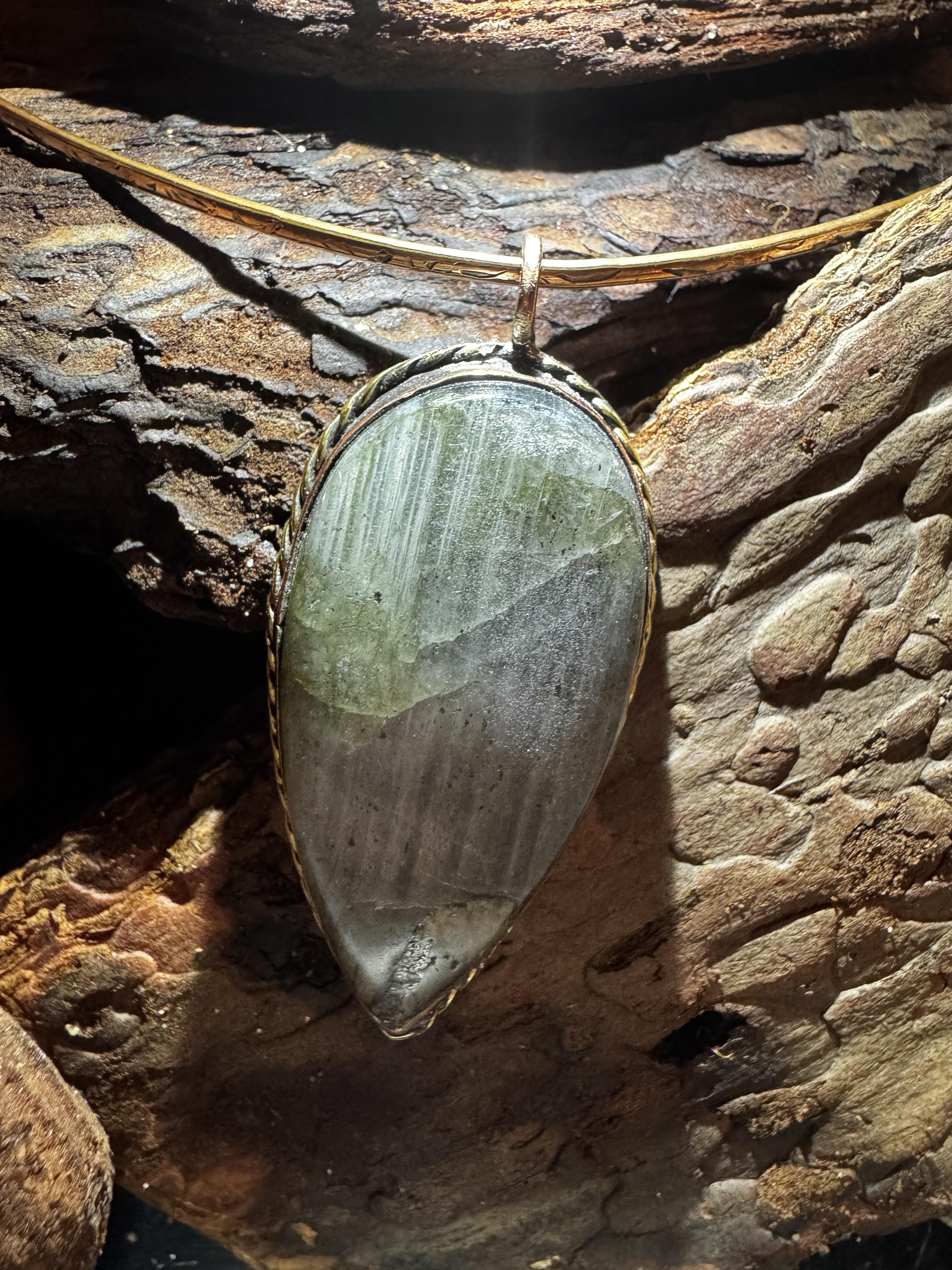 Dieser handgefertigte Halsschmuck aus Kupfer kombiniert minimalistisches Design mit natürlicher Ausstrahlung. Der schlichte, runde Halsreif trägt einen tropfenförmigen Labradorit-Cabochon, dessen geheimnisvolles Farbspiel je nach Lichteinfall in Grau-, Blau- und Grüntönen schimmert.