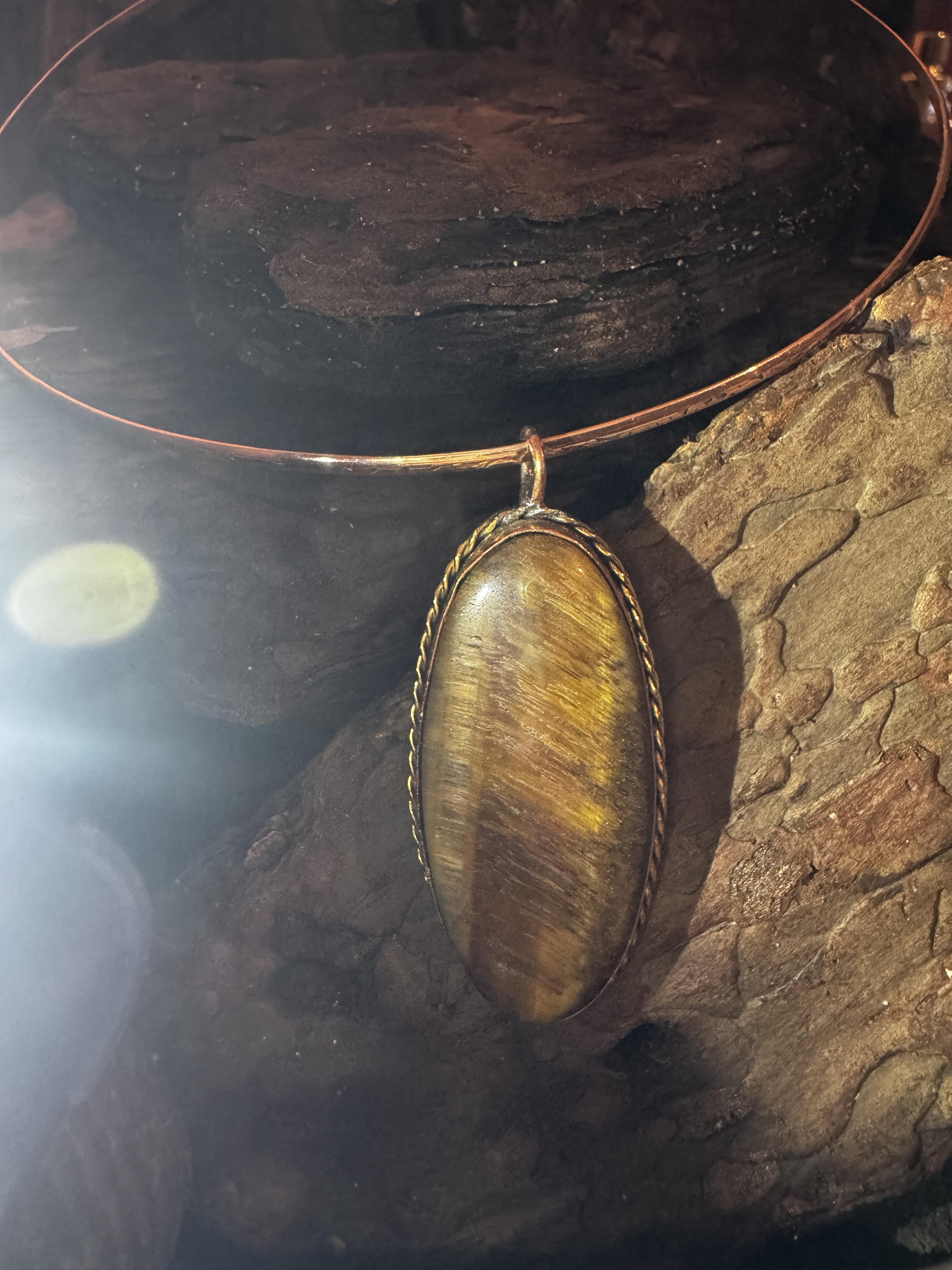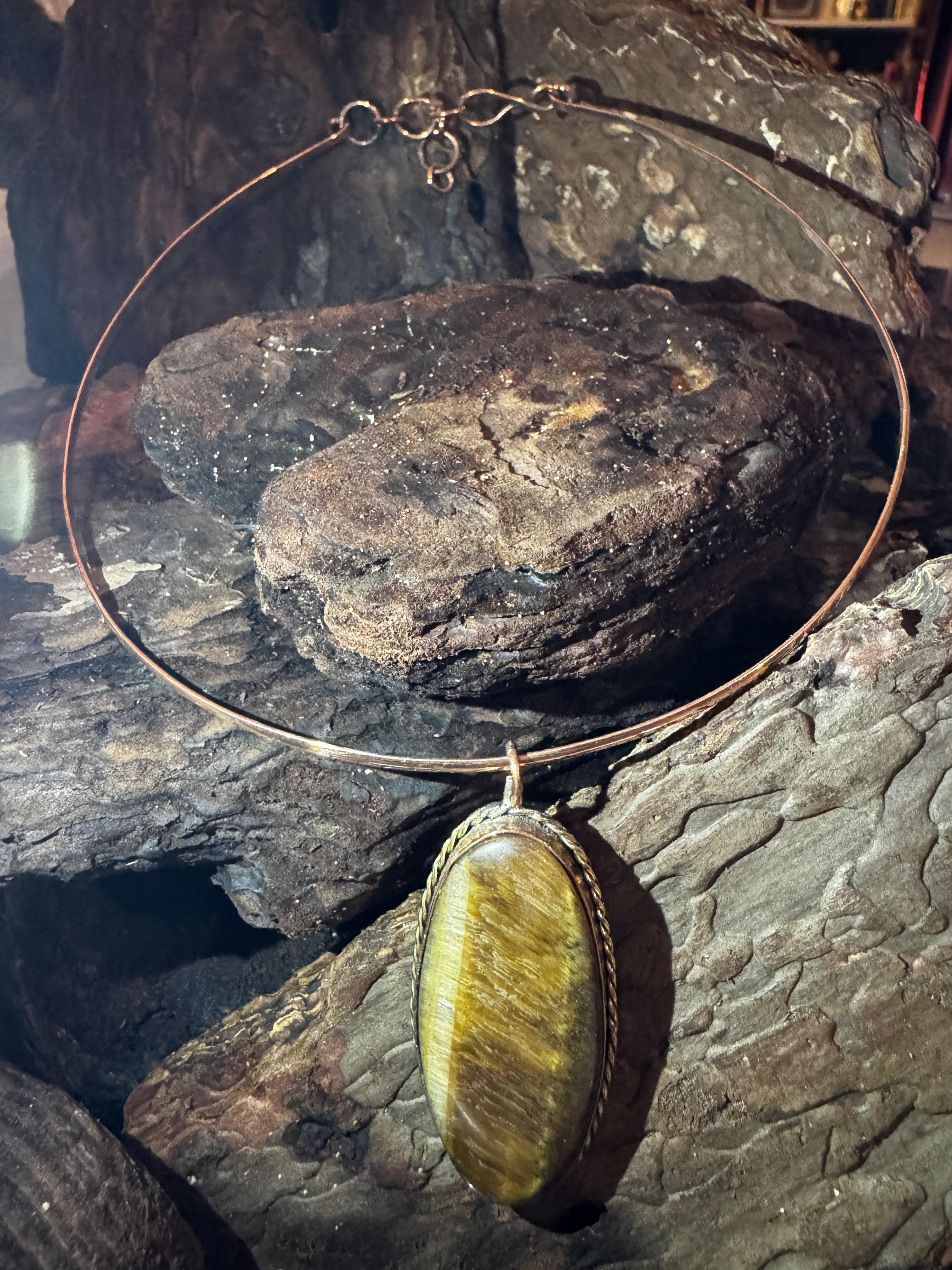 Dieser handgefertigte Halsschmuck aus Kupfer vereint minimalistisches Design mit natürlicher Wärme. Der schlichte Halsreif trägt einen ovalen Tigerauge-Cabochon, dessen goldbraune bis honigfarbene Töne im Licht lebendig schimmern.
