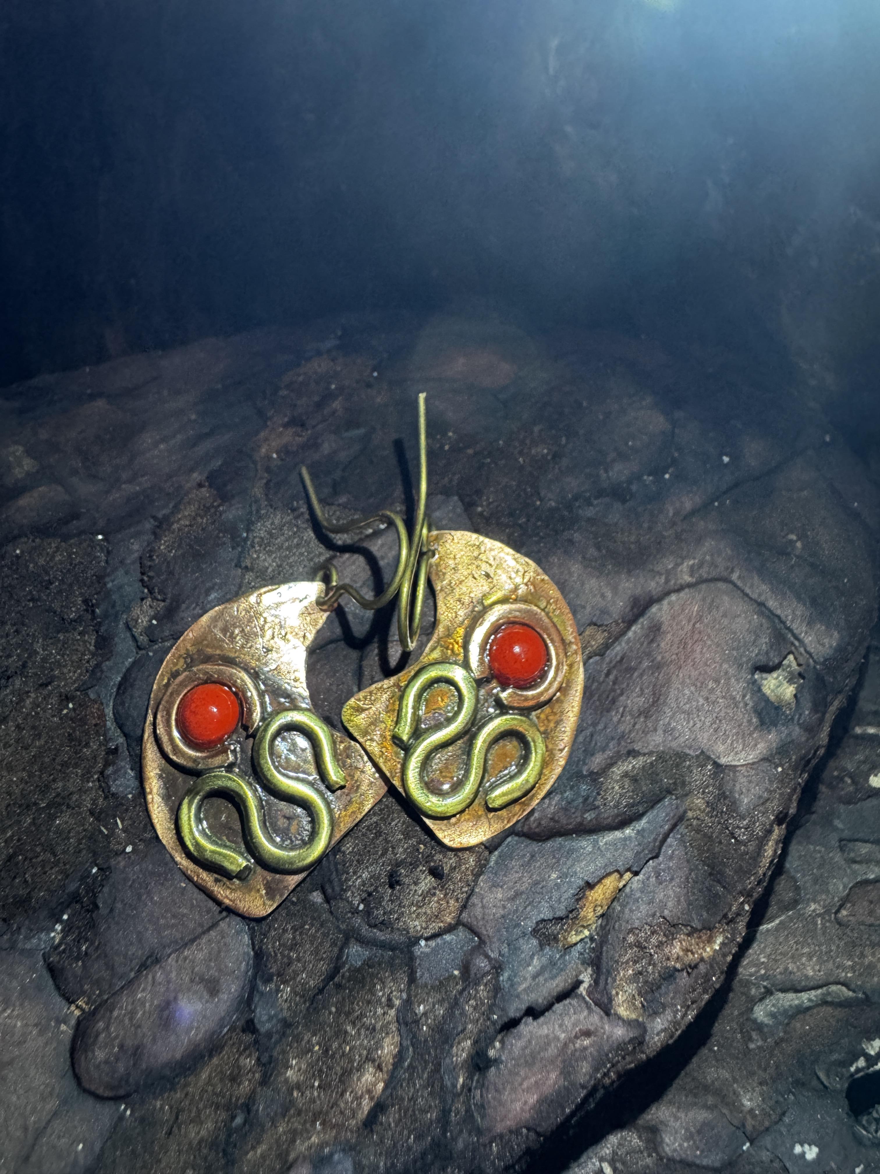 Diese handgemachten Ohrringe aus Kupfer und Messing begeistern mit ihrer modernen Halbmondform und warmen Metalltönen. Eine runde rote dekorative Einlage in Cabochon-Optik setzt einen kräftigen Farbakzent und wird durch geschwungene Messingornamente harmonisch ergänzt.