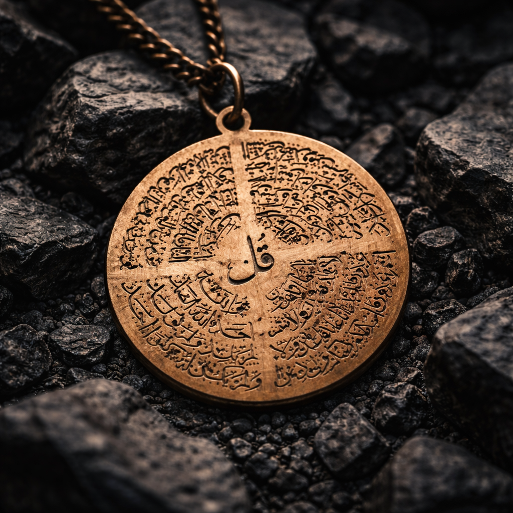 Auf der Rückseite befinden sich die Suren Al-Falaq, An-Nas sowie Al-Inshirah, die traditionell für Schutz, Trost, Erleichterung und innere Stärke stehen.