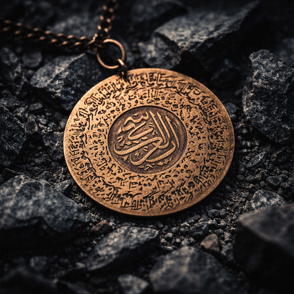 Die Vorderseite ist kunstvoll mit Ayet el Kürsi (Ayat al Kursi) graviert – einer der kraftvollsten Schutzverse des Qurans.