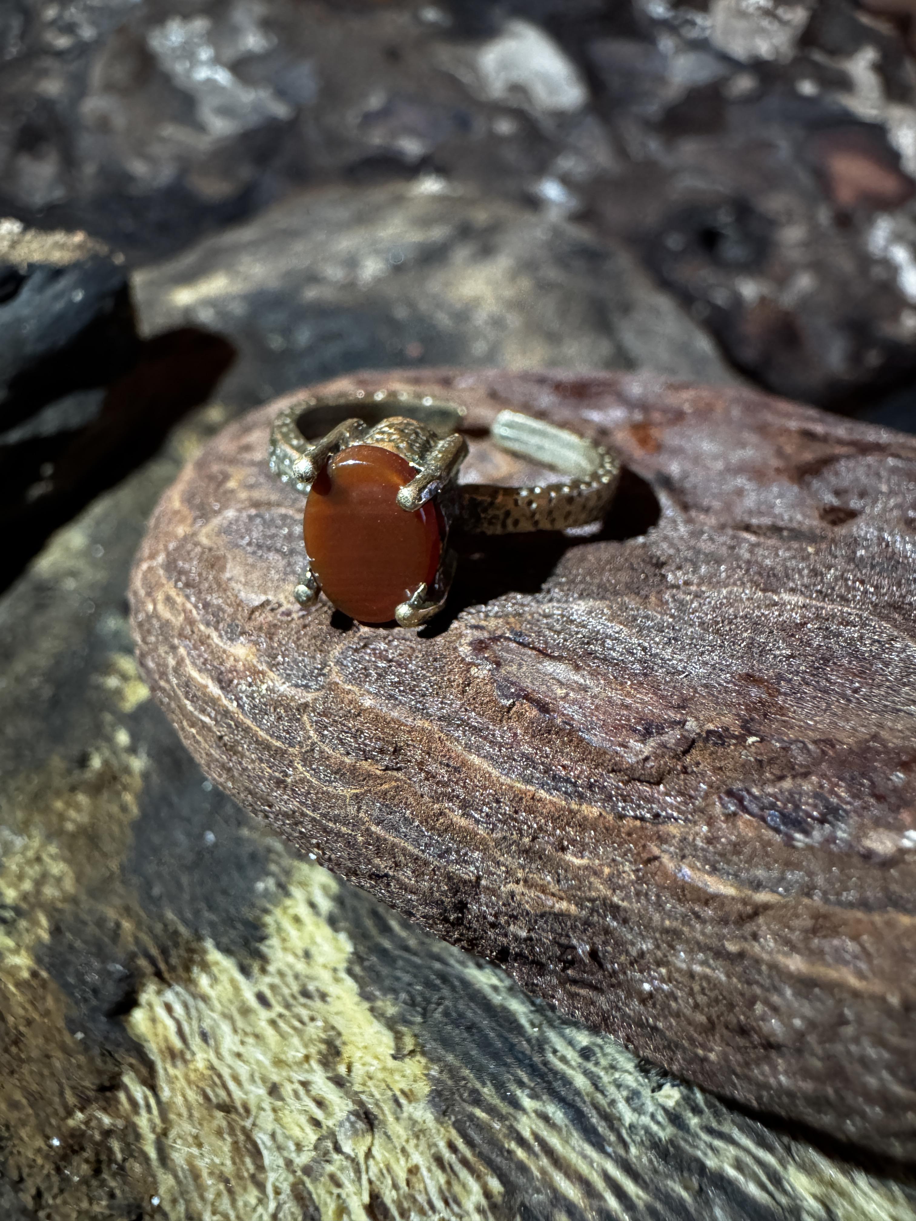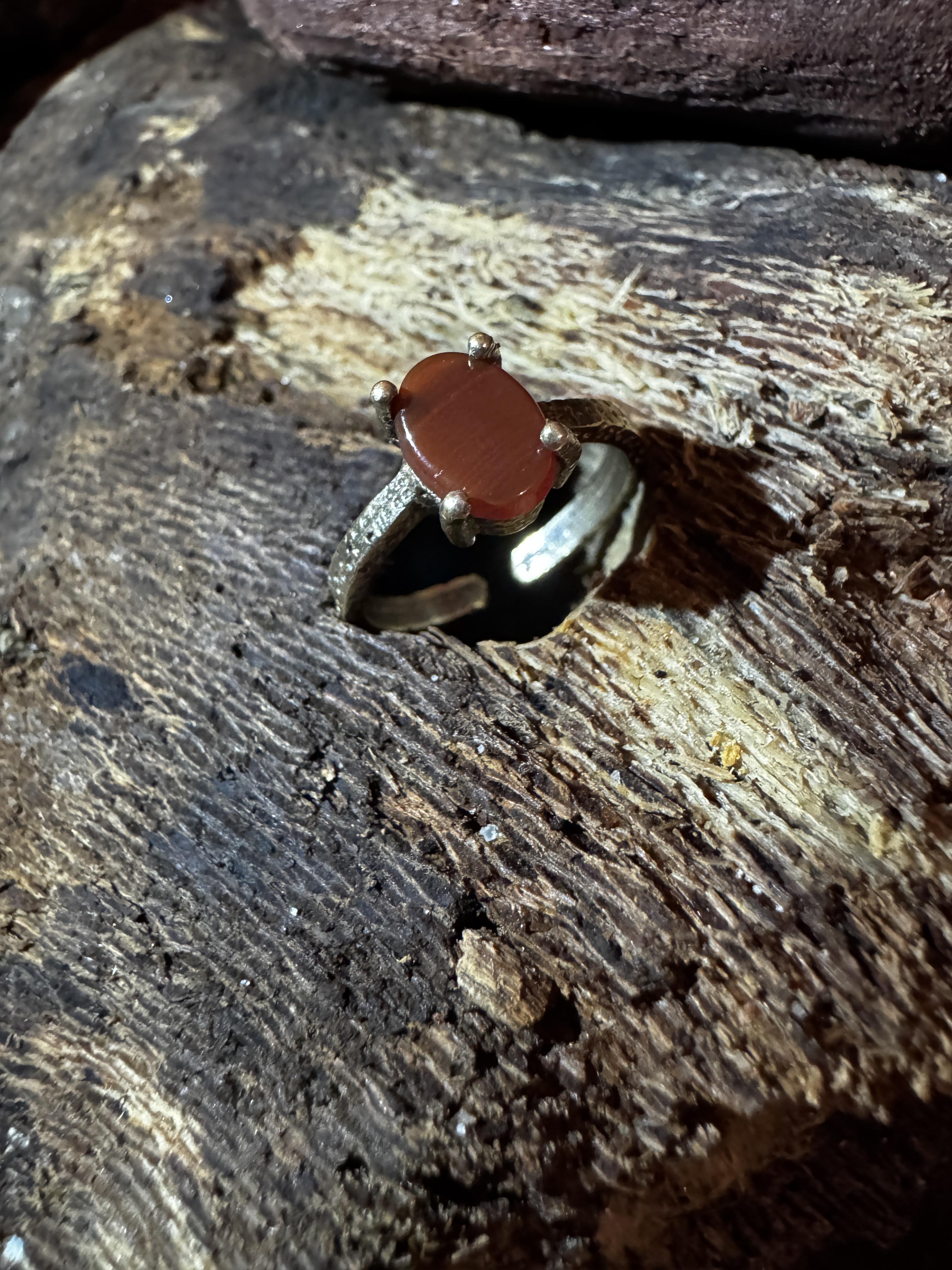 Dieser stilvolle Ring mit rotem Achat besticht durch seine warme, erdige Ausstrahlung und sein elegantes Vintage-Design. Der rund geschliffene Naturstein (roter Achat / kırmızı akik) schimmert sanft im Licht und wird von einer antik veredelten Fassung sicher gehalten.