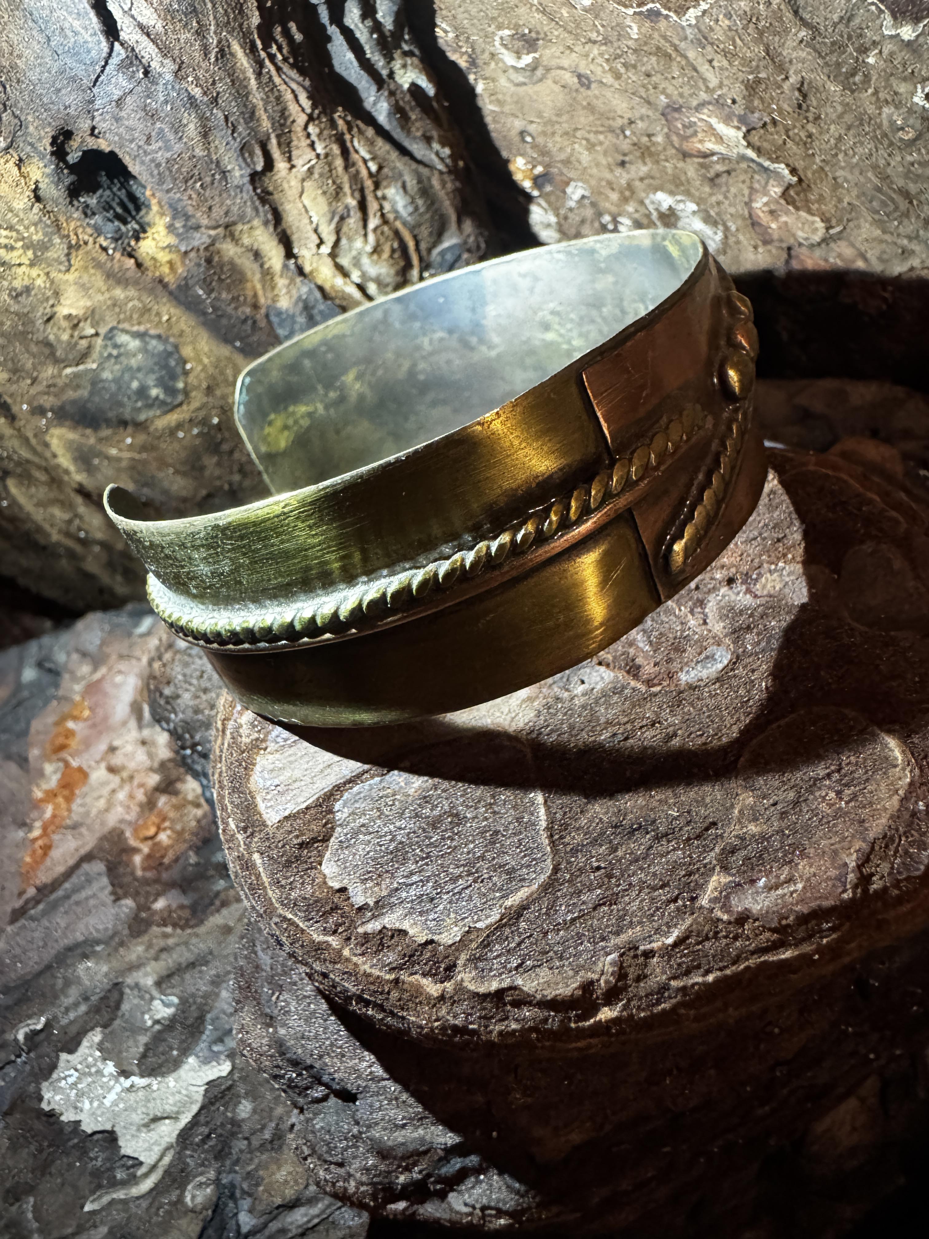 Dieser handgefertigte Armreif aus Messing und Kupfer vereint zwei warme Metalltöne zu einem ausdrucksstarken Design. Die Kombination aus goldfarbenem Messing und rötlichem Kupfer schafft einen natürlichen, harmonischen Kontrast und verleiht dem Schmuckstück seinen besonderen Charakter.
