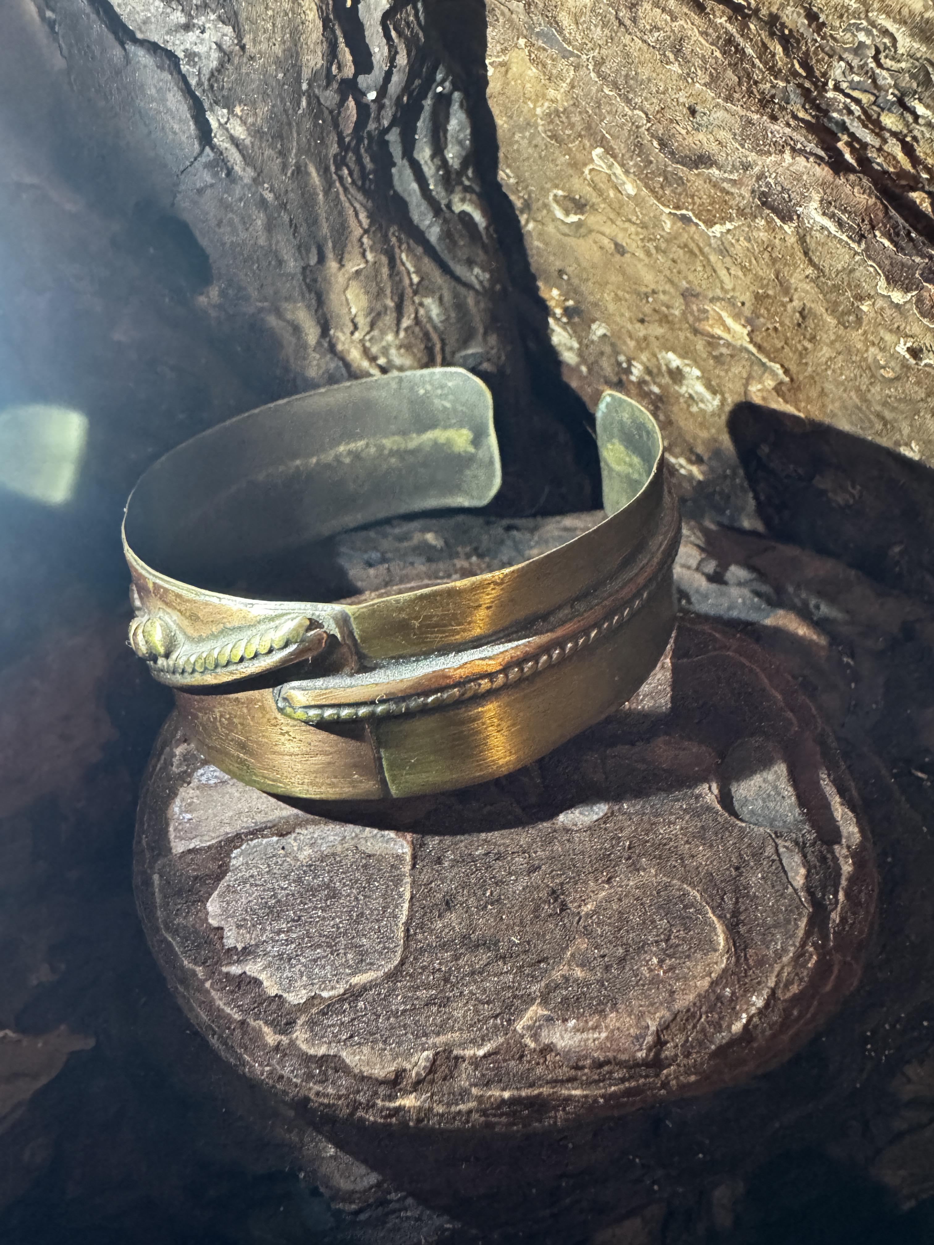 Gedrehte Drahtdetails, kleine Nieten und strukturierte Oberflächen unterstreichen den handwerklichen Stil und machen den Armreif zu einem echten Boho- und Vintage-Statement. Die bewusst gestaltete Patina sorgt für Tiefe und einen authentischen, leicht antiken Look.