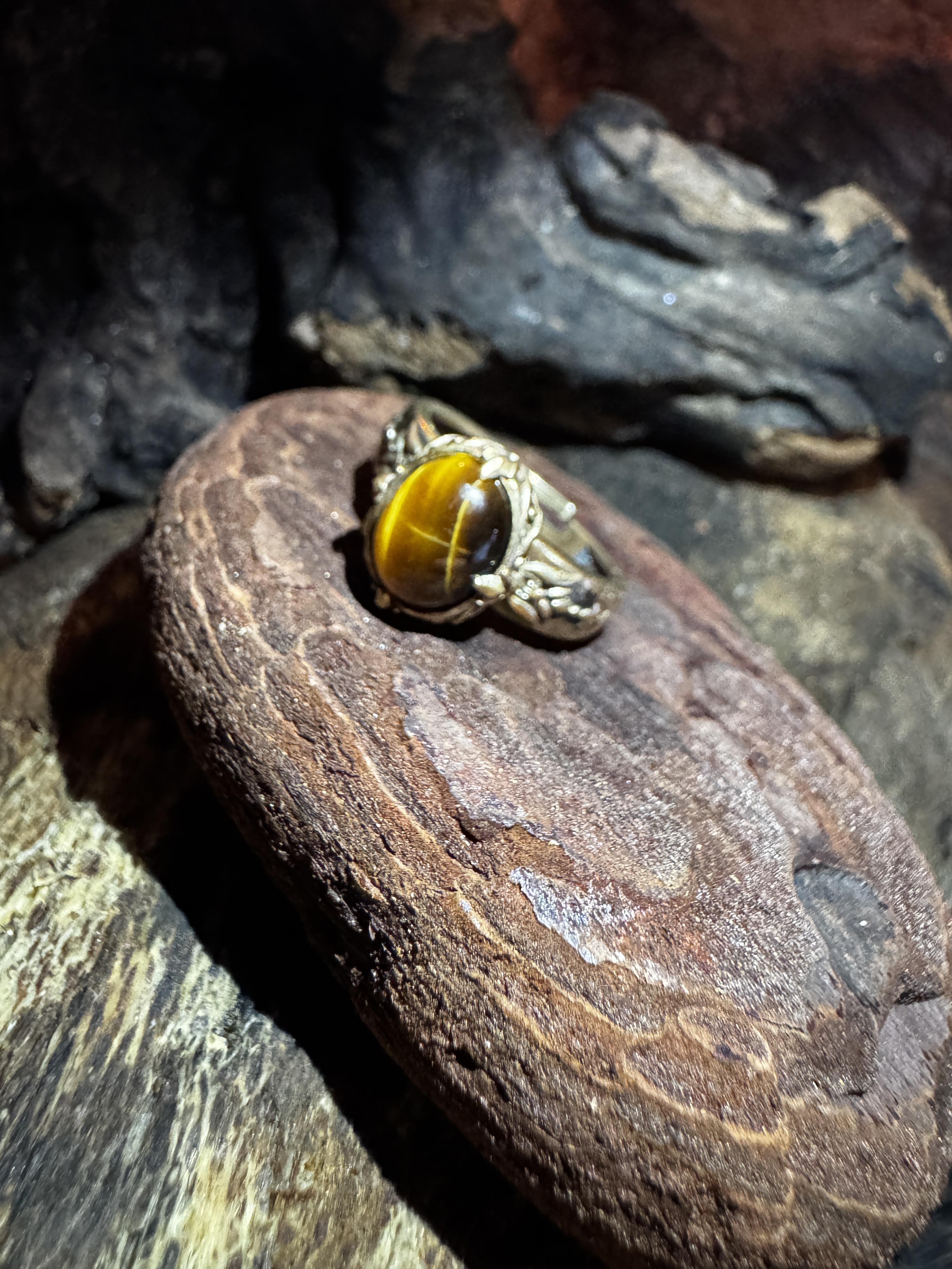 Dieses Modell kombiniert einen warm leuchtenden Tigerauge-Stein mit einer fein verzierten, klassischen Ringschiene im Vintage-Stil. Der runde Cabochon bringt die typische goldbraune Maserung und den seidigen Schimmer des Tigerauges besonders schön zur Geltung und verleiht dem Ring eine elegante, natürliche Ausstrahlung.