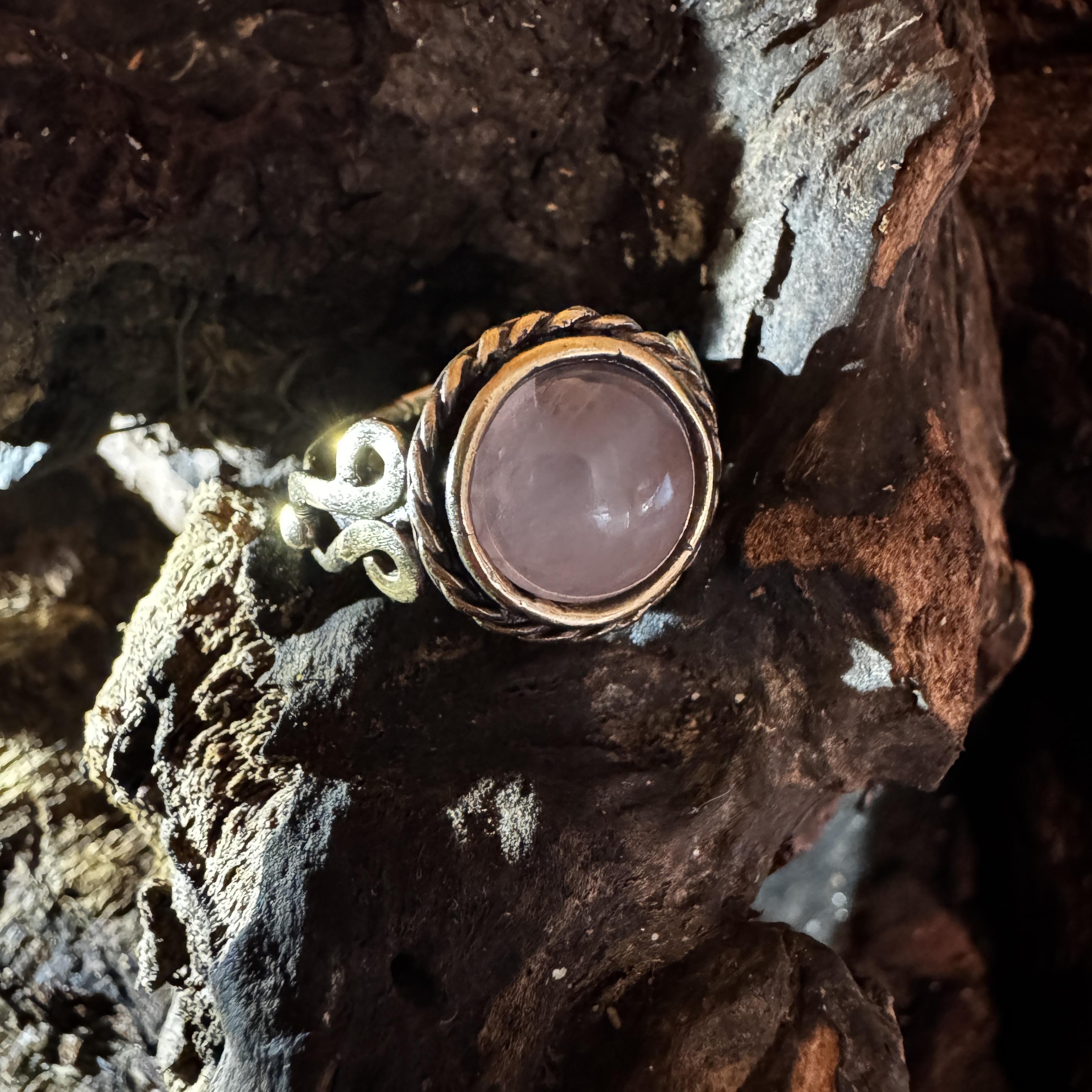 Dieser handgefertigte Rosenquarz Ring aus Messing-Kupfer Gemisch vereint warme Naturtöne mit filigranem Vintage-Design. Der sanft schimmernde echte Rosenquarz wird von einer dekorativen Fassung umrahmt und von kunstvollen Ornamenten getragen, die dem Ring eine elegante, antike Ausstrahlung verleihen. Durch die verstellbare Größe passt sich der Ring flexibel jedem Finger an und bietet hohen Tragekomfort.